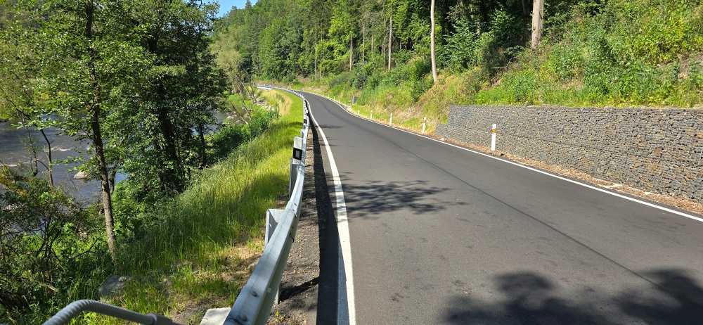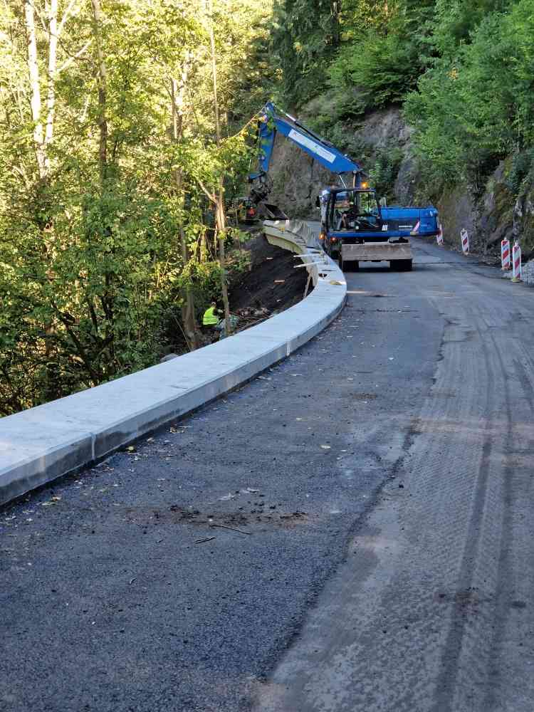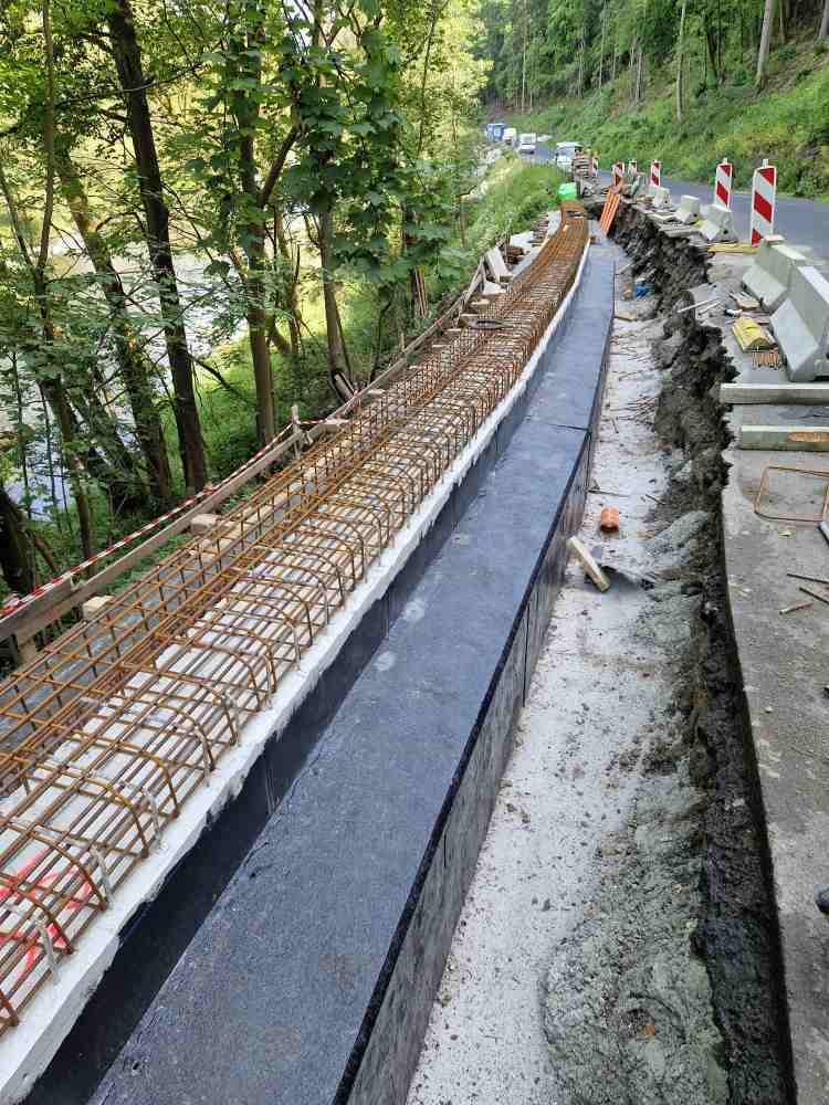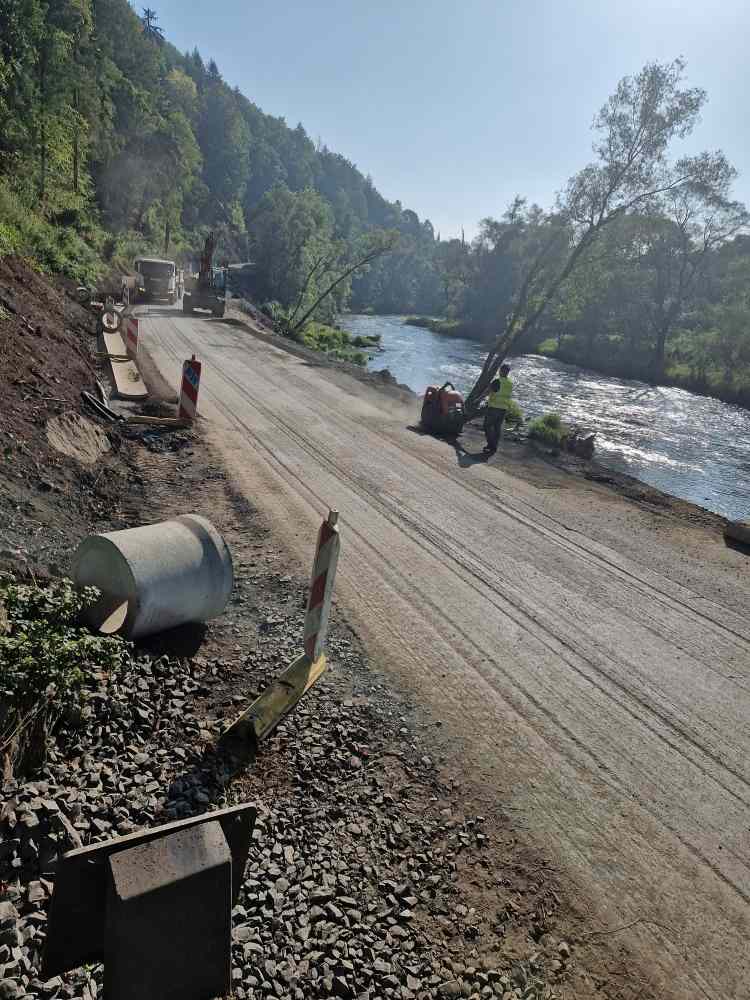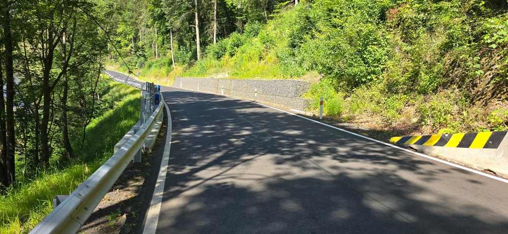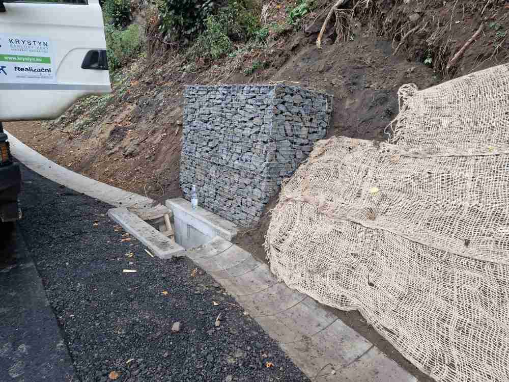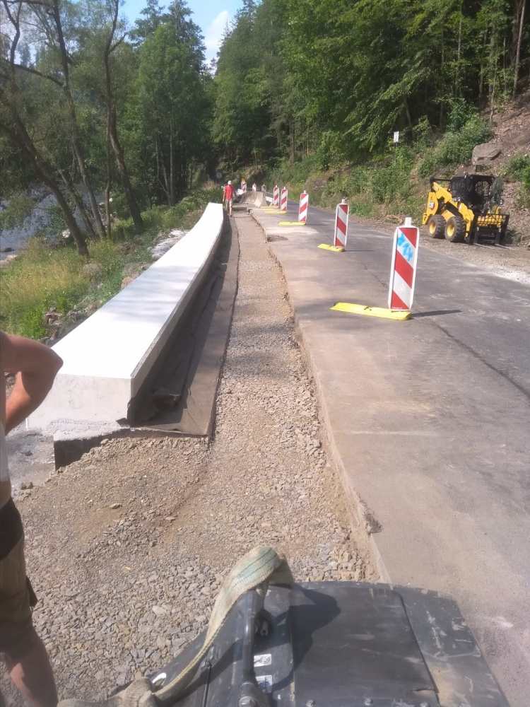Projekt uvažoval hlavně statické zajištění komunikace. Zde jsme vybudovali sérii tří železobetonových opěrných zdí na pilotovém založení. Mimo jiné zde byla také sanace svahu, kdy ke korytu řeky přišly největší kameny frakce 1000+ a následně se postupně prosypávaly menšími. Gabionová opěrná stěna byla naopak vybudována proti sesuvu svahu na od břehu odlehlé straně vozovky. V rámci stavby se zhotovoval kompletní systém odvodnění včetně propustků. Část stavby je odvodněna pomocí příkopových žlabů, druhá část má rigol dlážděna z žulových kostek.