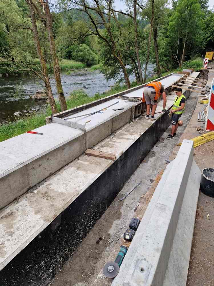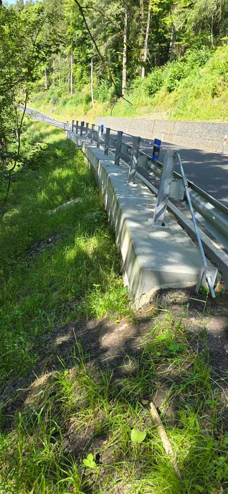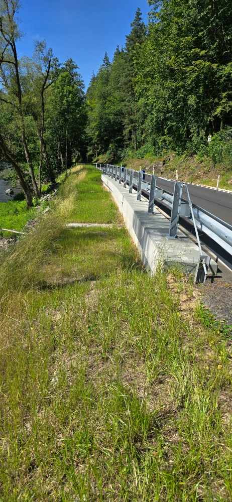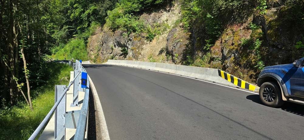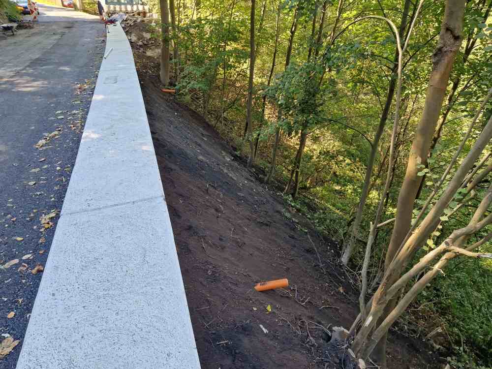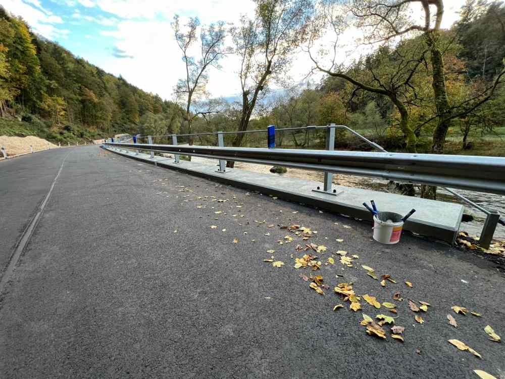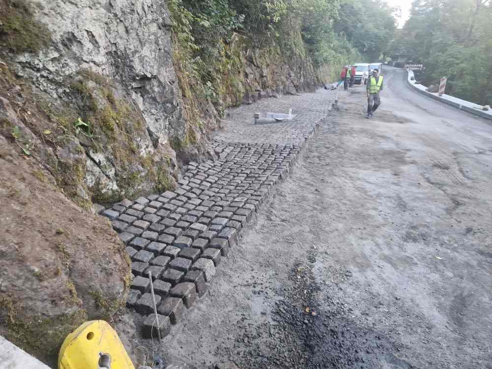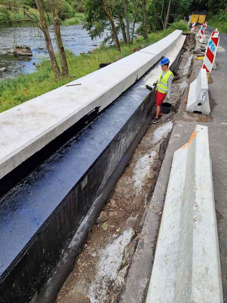 Projekt uvažoval hlavně statické zajištění komunikace. Zde jsme vybudovali sérii tří železobetonových opěrných zdí na pilotovém založení. Mimo jiné zde byla také sanace svahu, kdy ke korytu řeky přišly největší kameny frakce 1000+ a následně se postupně prosypávaly menšími. Gabionová opěrná stěna byla naopak vybudována proti sesuvu svahu na od břehu odlehlé straně vozovky. V rámci stavby se zhotovoval kompletní systém odvodnění včetně propustků. Část stavby je odvodněna pomocí příkopových žlabů, druhá část má rigol dlážděna z žulových kostek.