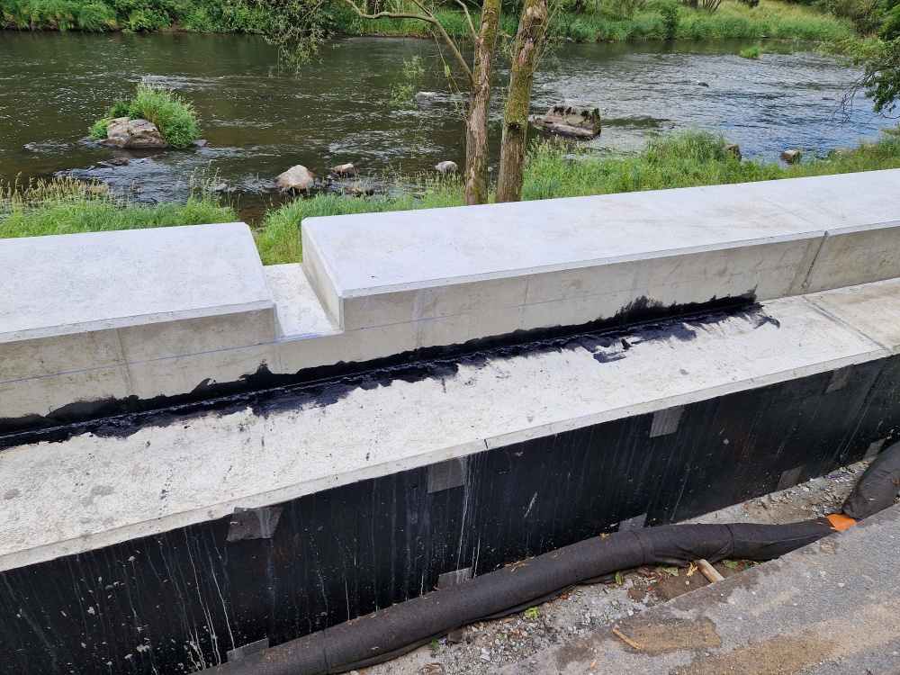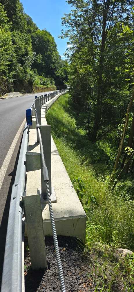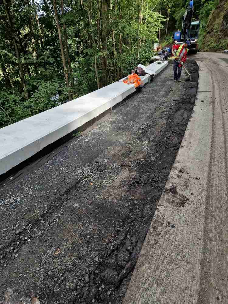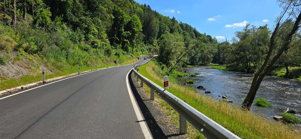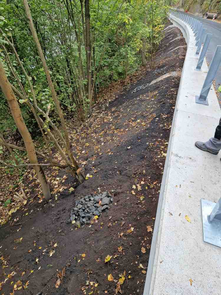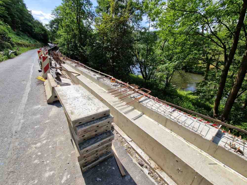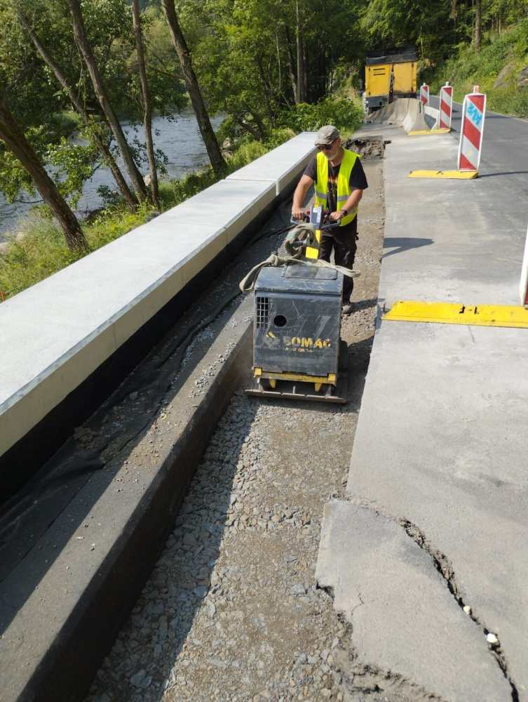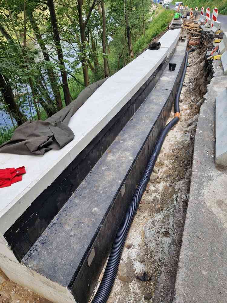 Projekt uvažoval hlavně statické zajištění komunikace. Zde jsme vybudovali sérii tří železobetonových opěrných zdí na pilotovém založení. Mimo jiné zde byla také sanace svahu, kdy ke korytu řeky přišly největší kameny frakce 1000+ a následně se postupně prosypávaly menšími. Gabionová opěrná stěna byla naopak vybudována proti sesuvu svahu na od břehu odlehlé straně vozovky. V rámci stavby se zhotovoval kompletní systém odvodnění včetně propustků. Část stavby je odvodněna pomocí příkopových žlabů, druhá část má rigol dlážděna z žulových kostek.